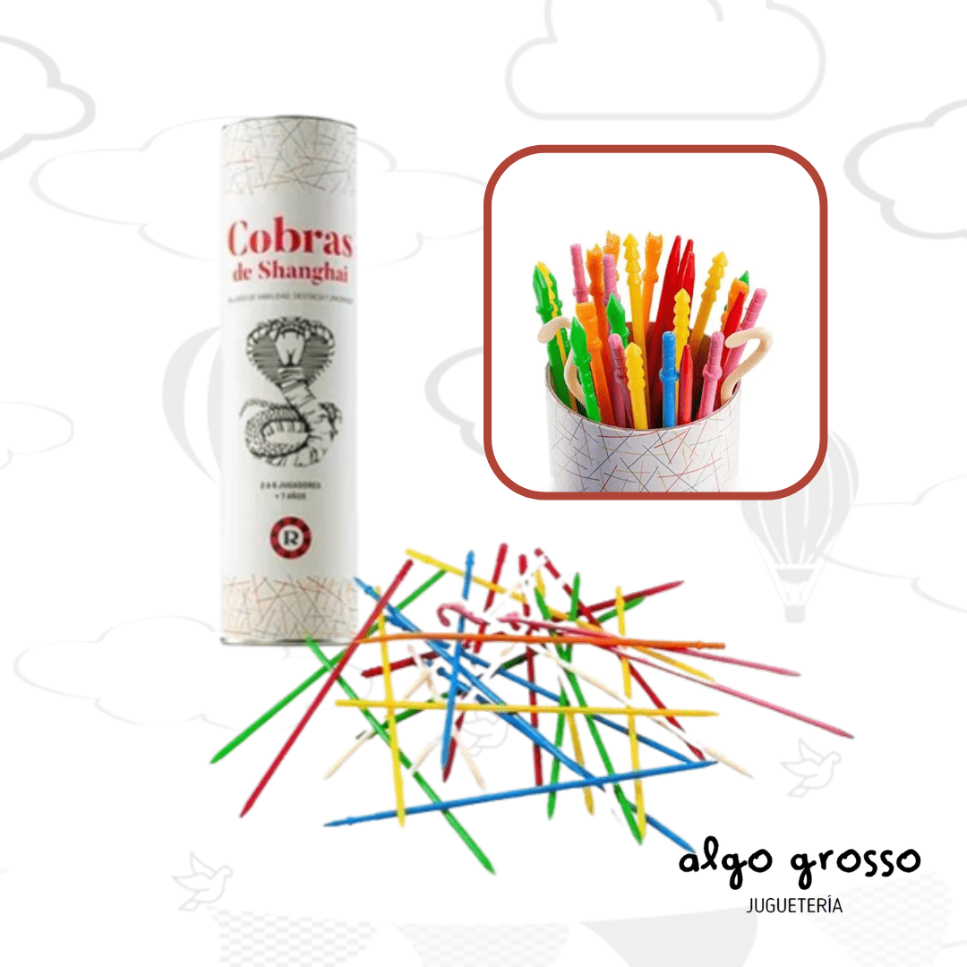 DESCRIPCIÓN:Las Cobras de Shanghai – Divertido juego de palillos chinos. Cada palillo tiene asignado un valor y debes juntarlos usando otro palillo. Quién consigue mayor puntaje gana. Las imágenes son de carácter ilustrativo. Los colores pueden variar. de 2 a 6 jugadores