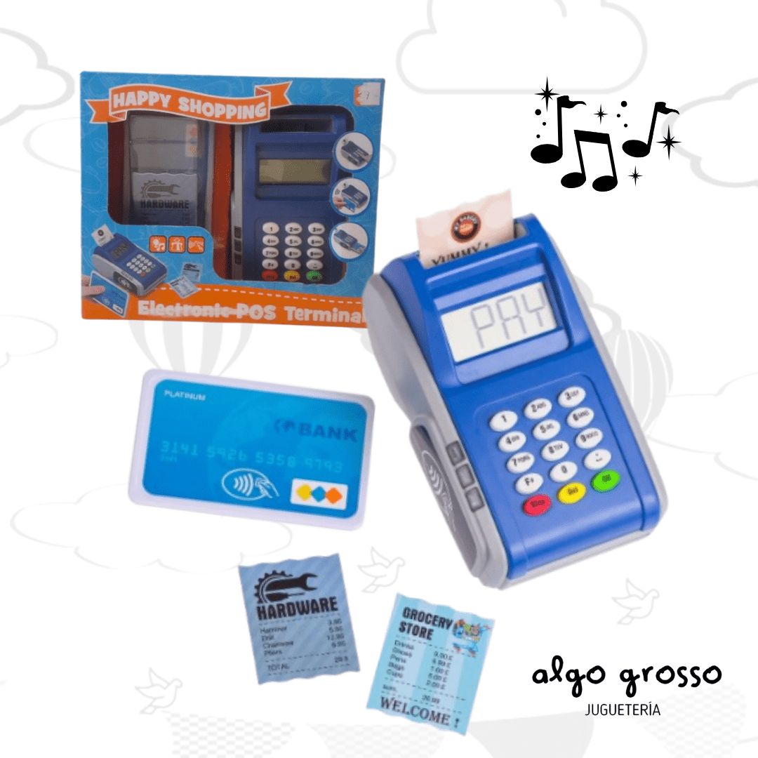 DESCRIPCIÓN: Set de terminal POS electrónica ideal para juego de roles. Incluye lector de tarjetas, ticket simulado, tarjeta bancaria, y variedad de alimentos de juguete como jugos, galletas, latas, botellas y panecillos. Estimula la imaginación, el lenguaje y el aprendizaje del intercambio. Utiliza 3 pilas AAA (no incluidas)